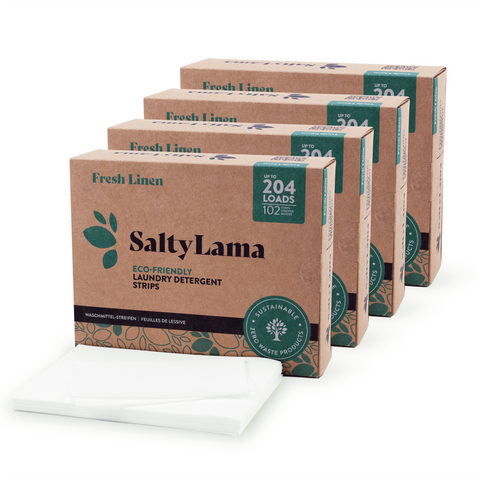 Ya sea que la jarra de plástico de detergente líquido o la incómoda caja de polvo tóxico se hayan vuelto demasiado pesadas para transportar o simplemente desee liberar espacio adicional en los estantes, las sábanas hipoalergénicas y libres de crueldad animal de SaltyLama siguen siendo las más delgadas, alternativa más ligera. Tan fuerte como es el papel Kraft, y lo notará de inmediato, nuestros elegantes paquetes se deslizarán sin esfuerzo en cualquier cajón o espacio pequeño hasta que los necesite.